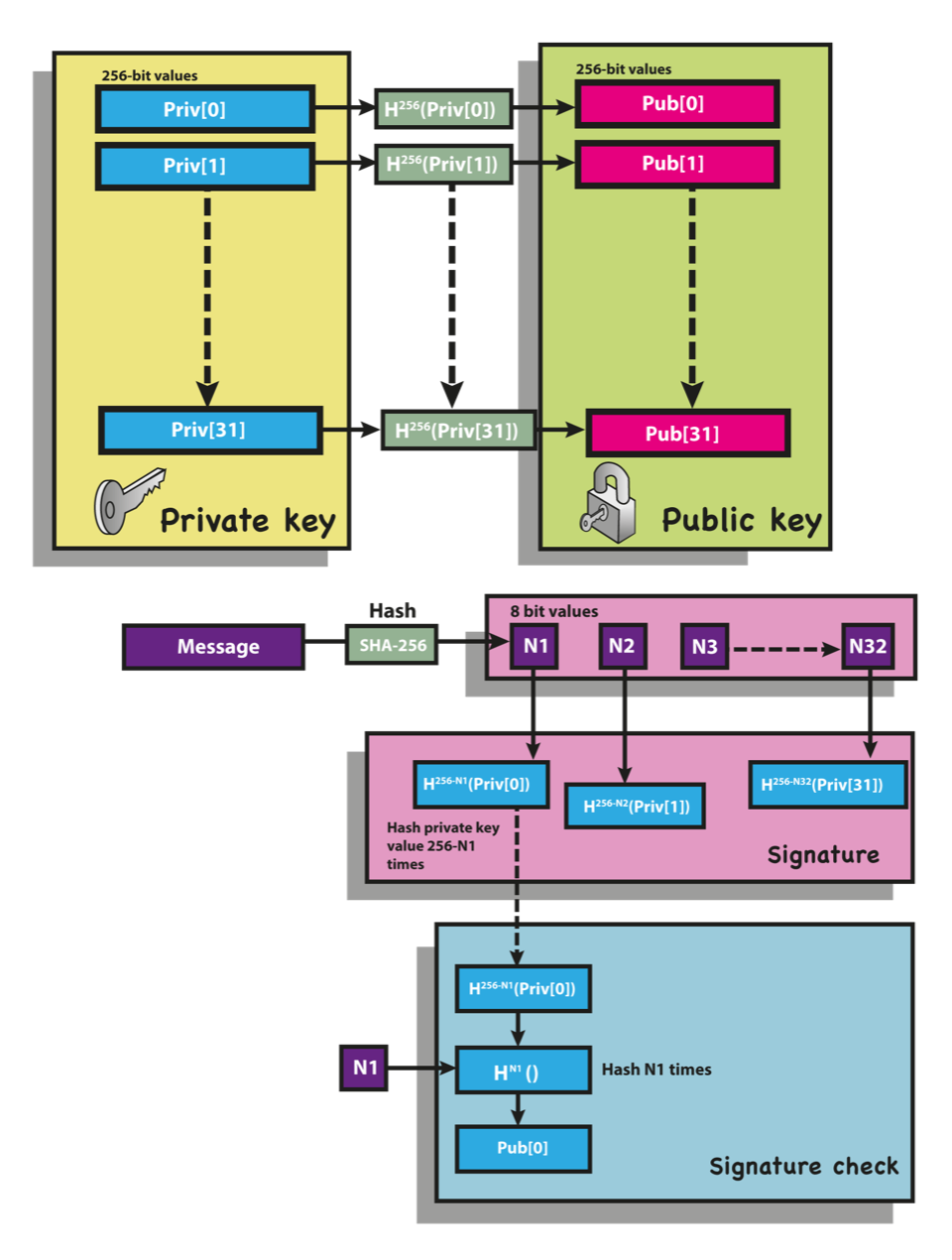 The W-OTS scheme follows the Lamport signature approach but allows a signer to sign