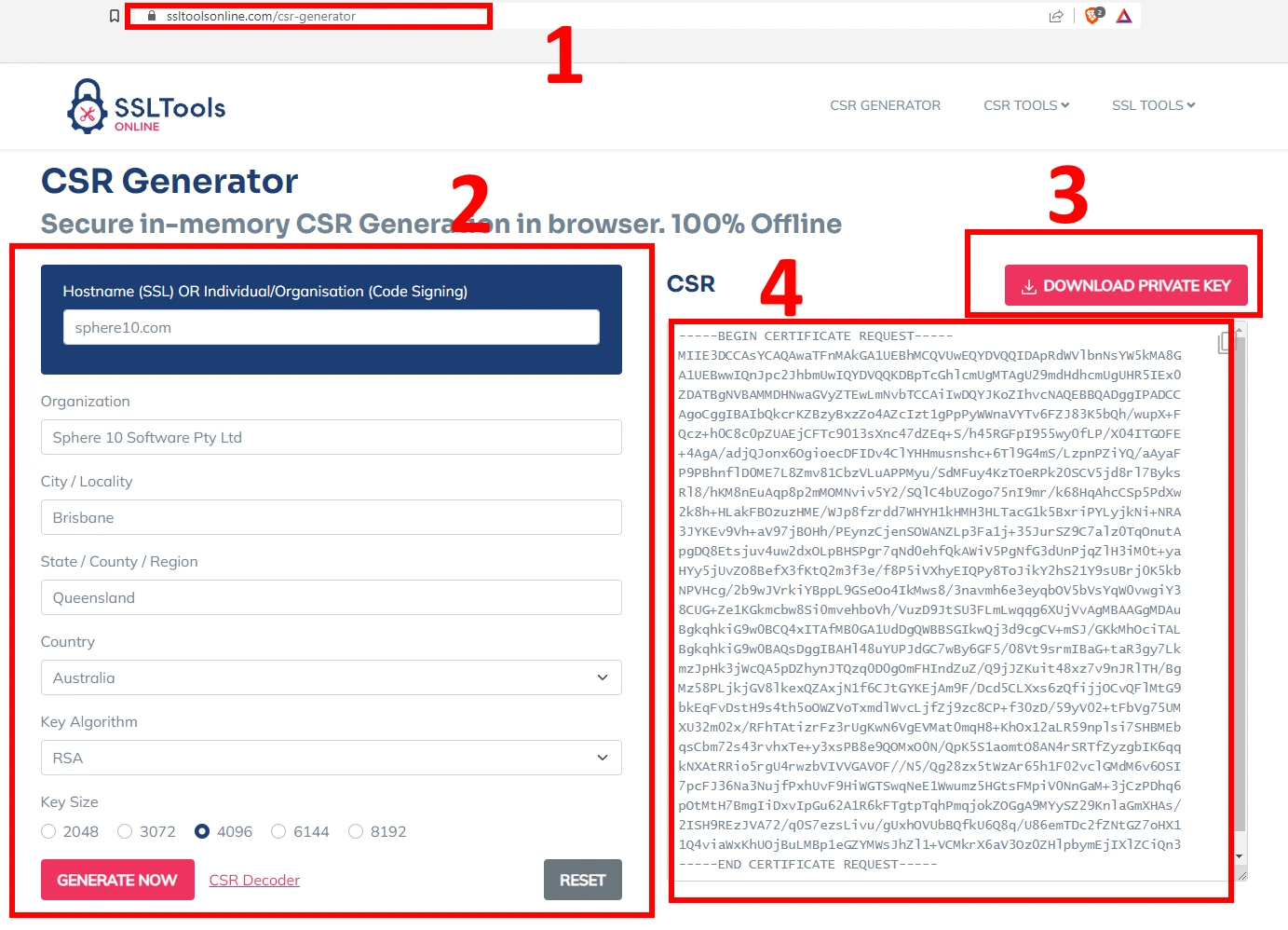 To generate a CSR in a few simple steps, Sphere 10 Software recommends using this online tool .
